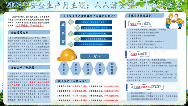公司组织开展2023年安全生产月培训、消防安全知识宣讲及地震应急演练活动,组织员工参与全国“安康杯”知识竞赛活动,通过层层传导安全责任,要求各部门牢固树立安全生产责任意识,做到人人目标明确、责任到位,为开展“安全生产月”工作打好基础。