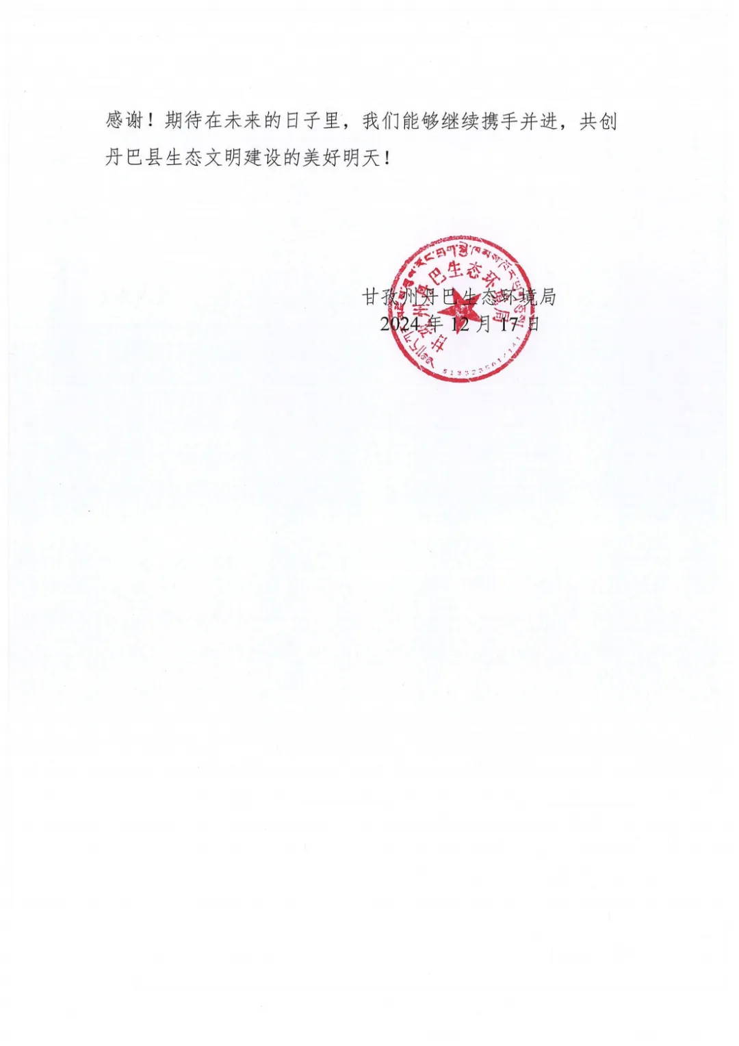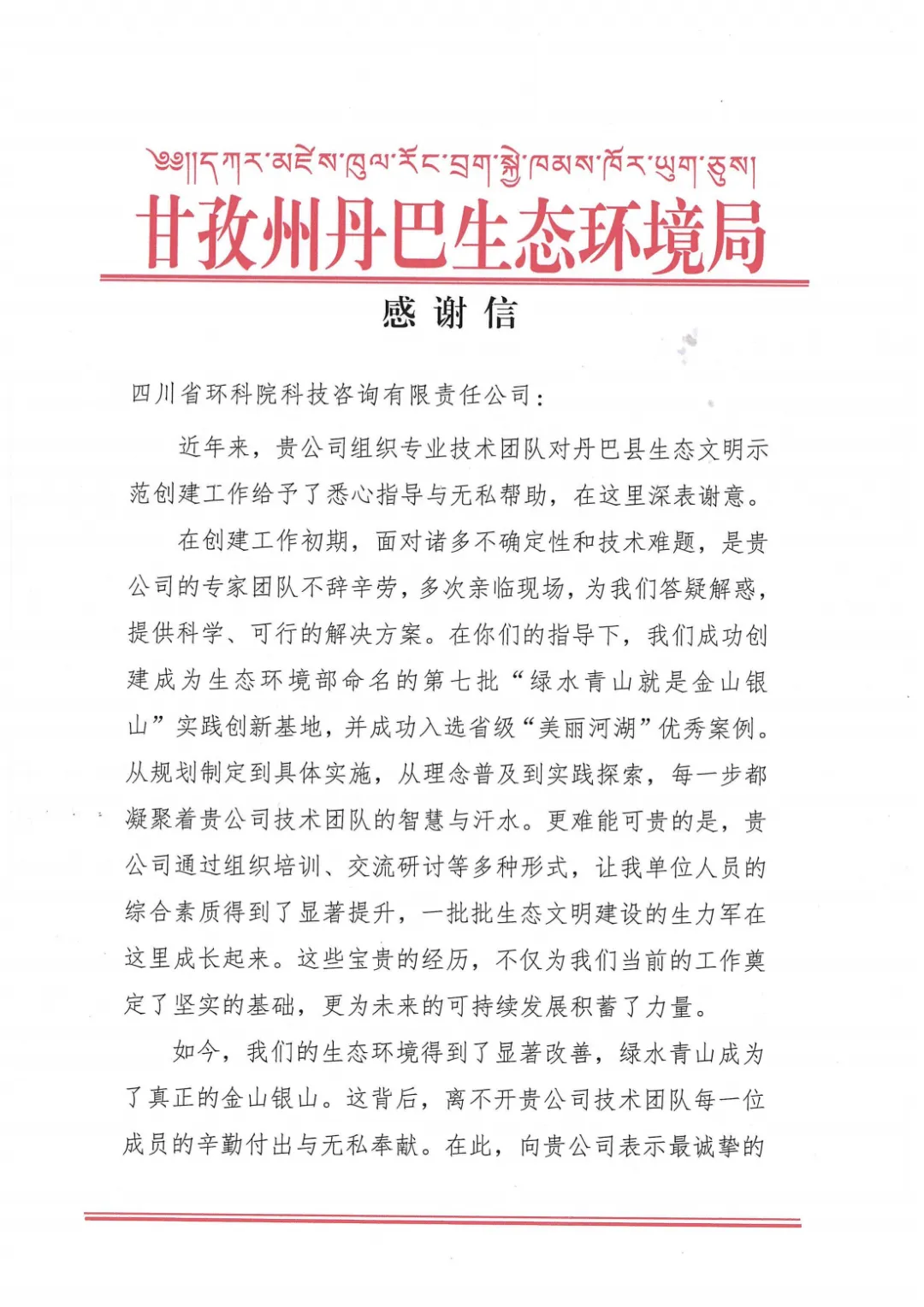 正是因为技术团队的艰辛付出,才取得这些优异的工作成果,也得到了地方部门的高度认可。甘孜州丹巴生态环境局特发来感谢信,向我司表示诚挚的感谢,这封感谢信不仅是对我司技术实力的肯定,更是对团队敬业精神的高度赞誉。