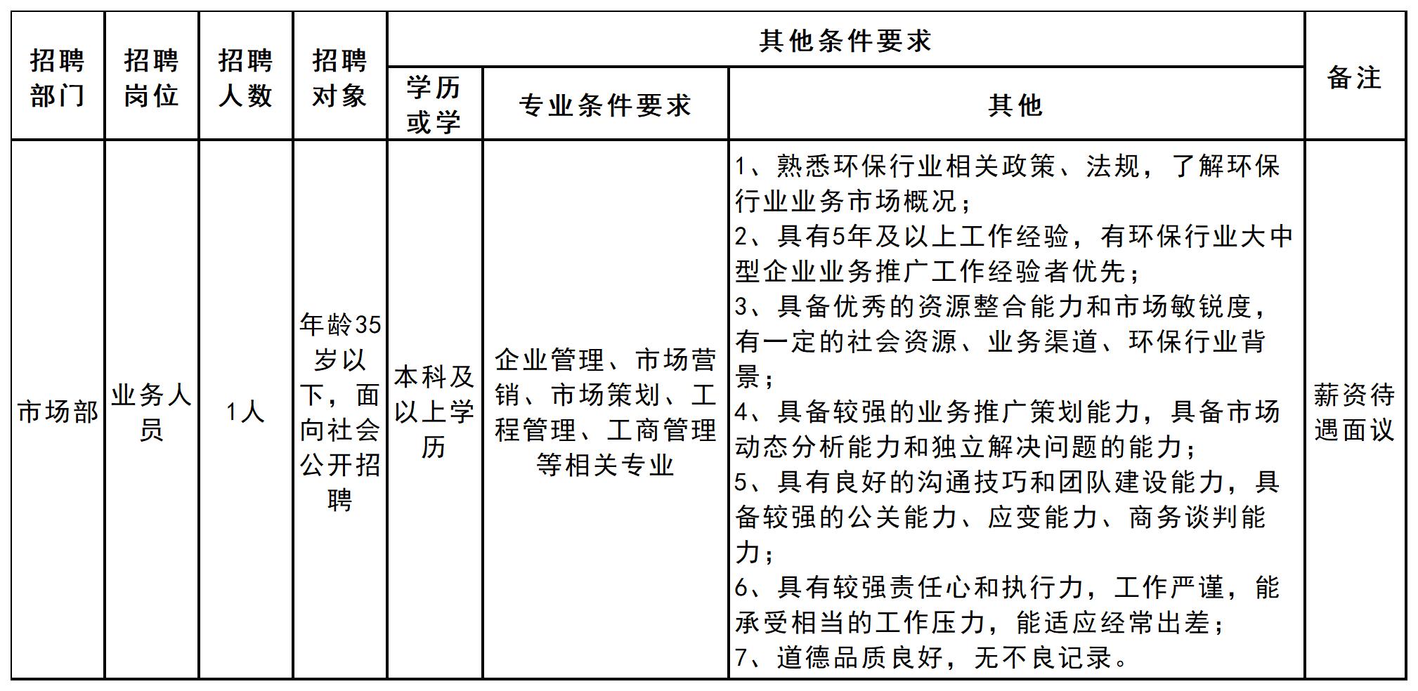 市场部 | 市场部业务员 | 1 | 面向社会公开招聘 | 不限 | 专业不限 | 1、具有企业市场营销经验者优先; 2、具备一定的社会资源、业务渠道、环保行业背景; 3、具备较强的业务推广策划能力,具备市场动态分析能力和独立解决问题的能力; 4、具有良好的沟通技巧和团队建设能力,具备较强的公关能力、应变能力、商务谈判能力; 5、具有较强责任心和执行力,工作严谨,能承受相当的工作压力,能适应经常出差; 6、能适应项目出差、项目外派等工作安排。