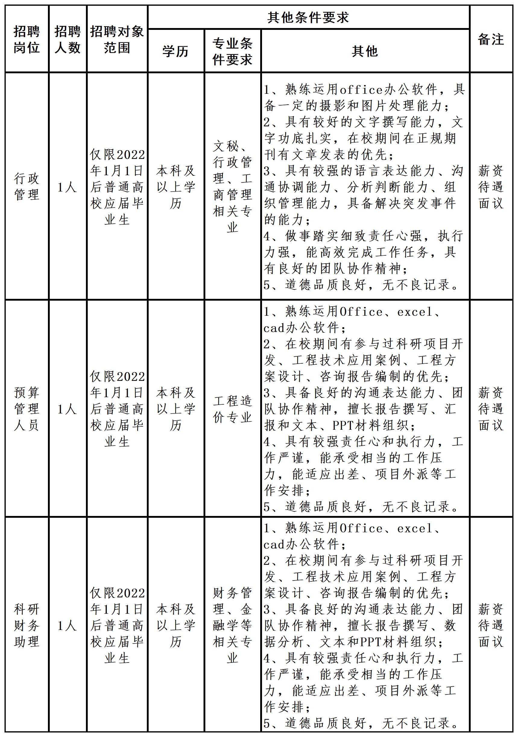| 注册二级建造师 | 1 | 面向社会公开招聘 | 普通高校本科及以上学历 | 市政专业 | 1、熟练使用Office办公软件,CAD绘图软件的优先; 2、具有独立开展本专业工作的经验,具有一定的技术方案撰写能力; 3、具有市政公用工程施工总承包贰级及以上资质单位工作经验,主持或参与市政公用工程项目2项及以上工作业绩; 4、有评奖评优经历或参与过科技厅、环保厅等科研项目经验的优先; 5、思想政治素质和职业操守好,遵纪守法、诚实守信,无不良记录; 6、中共党员优先。 | 待遇面议 |